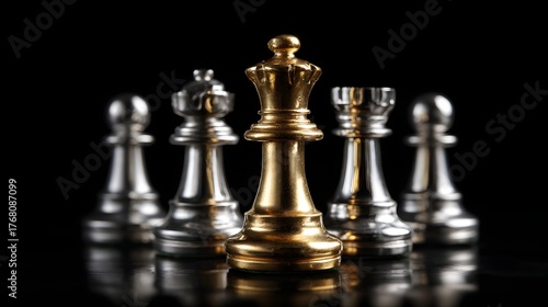 Prominent golden chess queen stands forward surrounded by supporting silver pieces against a dark background