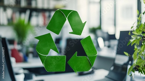 Promoting sustainability and green initiatives in a modern office environment with a prominent recycling symbol