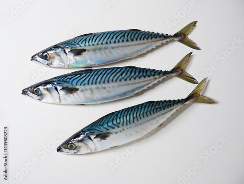 Photorealistic Atlantic mackerel fish, isolated on a pure white background, lateral side view, showing distinctive blue-green striped back and silver belly, high detail of scales, realistic lig