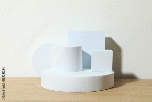 Props for product photography. Different podiums on the table
