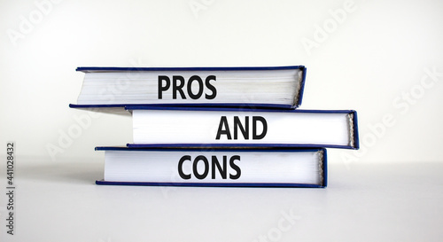 Pros and cons symbol. Books with words 'Pros and cons'. Beautiful white background. Business, pros and cons concept, copy space.