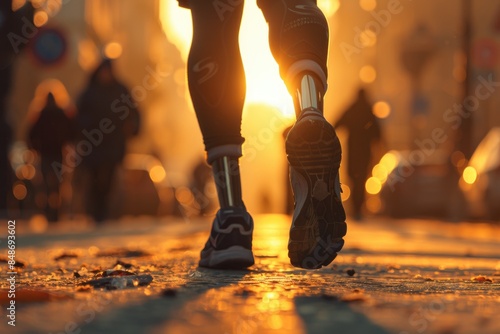 Prosthetic Athlete Running at Sunrise on City Street Determination, Strength, and Resilience