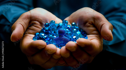 Protecting Your Valuable Team: A businessman's hands gently cradle a group of blue figures, symbolizing the care and protection afforded to a valued team. A powerful image representing workforce.