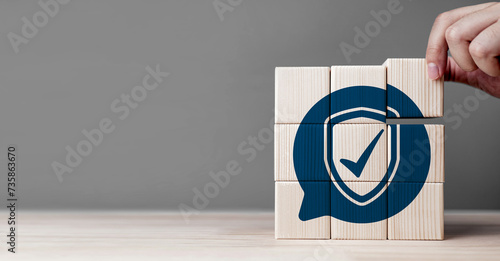 Protection and safety. concepts of Business information security and security systems. Shield symbol on wooden block. with copy space