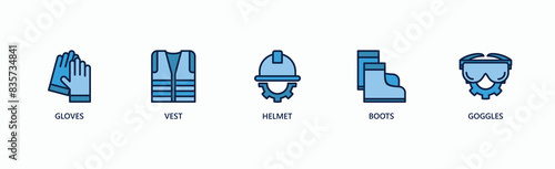 Protective Gear Banner Web Icon Vector Illustration Concept With Gloves, Vest, Helmet, Boots, Goggles