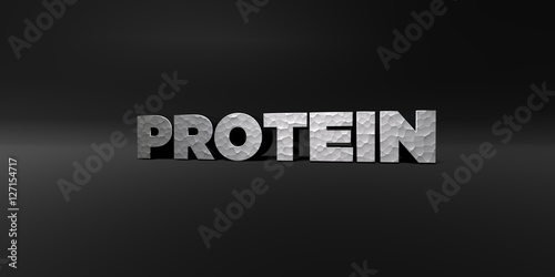 PROTEIN - hammered metal finish text on black studio - 3D rendered royalty free stock photo. This image can be used for an online website banner ad or a print postcard.
