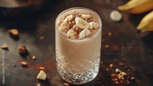 Protein Shake in a Clear Glass with Banana Slices Displayed in Standard View
