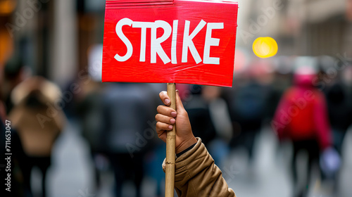Protestor holding a red 'STRIKE' sign during a demonstration.