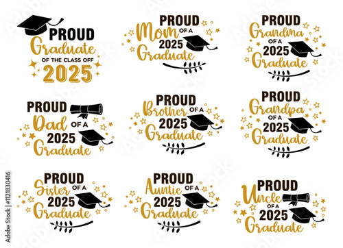 Proud family of a 2025 Graduate . Trendy calligraphy inscriptions with black hat