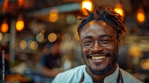 Proud friendly young male chef, with short afro hair and smile in a minimalist kitchen. The male Chef Looks confident into camera.
