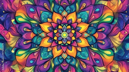 Psychedelic abstract illustration featuring a mandala design as a vibrant background element