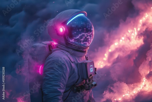 psychedelic astronaut enveloped in neon tubes radiating pink blue and violet hues standing boldly in a surreal landscape capturing the essence of retro futurism and cosmic exploration