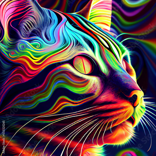 Psychedelic colorful waves and swirls make up the face of a cat. Three quarter view artwork.