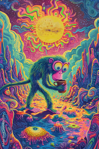 psychedelic monkey in a surreal fantasy landscape, vibrant digital painting with swirling colors, glowing abstract shapes, neon dreamlike jungle scenery, cosmic and visionary artistic illustration