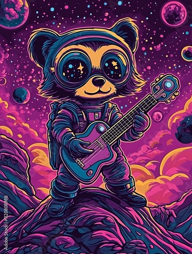 Psychedelic Raccoon Astronaut Playing Guitar on an Alien Planet.