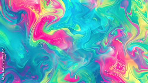 Psychedelic waves of color blend in a mesmerizing fluid pattern, evoking a sense of dreamy nostalgia