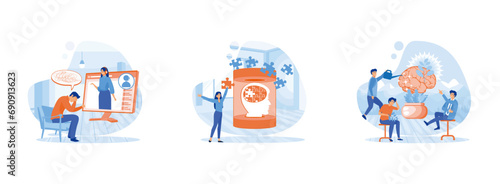 Psychological counseling. Psychotherapy practice. Psychotherapy and psychological support for patient care. Psychologist 1 set flat vector modern illustration