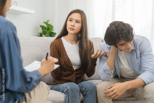 Psychology, depression asian young couple love, woman, man patient consulting problem mental health with psychologist, psychiatrist at clinic together, wife encouraging husband, therapy health care.