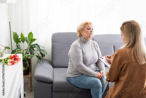 Psychology, depression. Suffering old woman, consulting with psychologist, psychiatrist while patient counseling mental problem. Encouraging, therapy, health care.