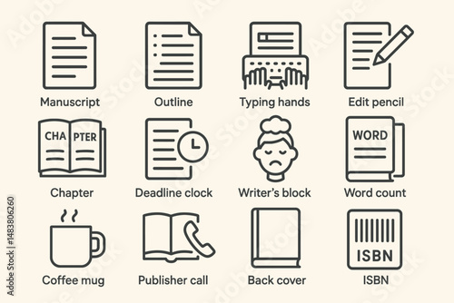 Publishing icons: manuscript, chapter, writer's block, isbn, word count