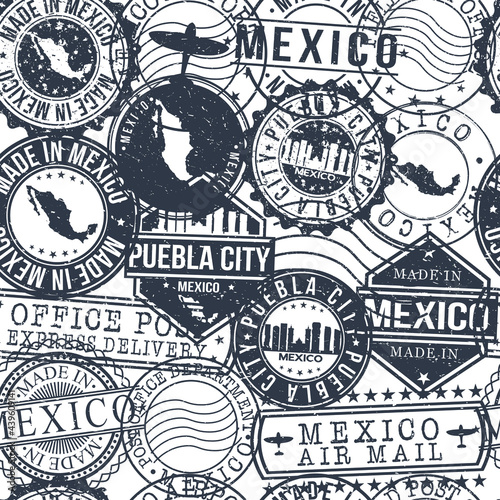 Puebla City Mexico Stamps Background. A City Stamp Vector Art. Set of Postal Passport Travel. Design Set Pattern.