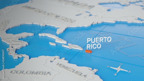 Puerto Rico highlighted on a white simplified 3D world map. Digital 3D render.