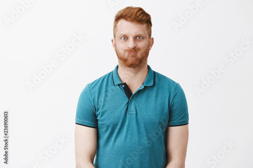 Puff up like balloon. Friendly playful and carefree redhead mature caucasian guy with bristle holding breath inside mouth and pouting with childish expression and smile, fooling around over grey wall