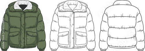 Puffer jacket fashion flat sketch, winter coat with fur collar, front and back view technical drawing, vector template design