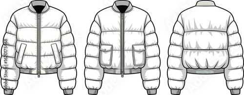 Puffer Jacket Front and Back Views, CAD Drawing, Flat Vector Fashion Illustration, Winter Outerwear Design Template for Apparel
