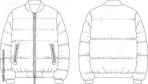 Puffer jacket technical sketch, fashion CAD drawing, winter clothing template, garment front and back view, flat vector illustration