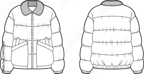 Puffer jacket with shearling collar flat sketch, front and back technical drawing, winter coat CAD illustration, fashion outerwear design template, warm clothing blueprint, sewing pattern vector