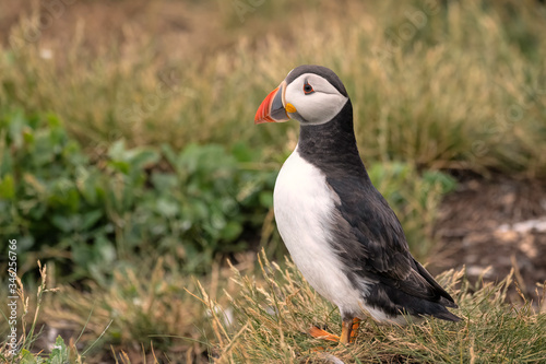 Puffin standing in a field next to its burrow. Image taken in the Farne Islands, United Kingdom.
