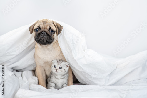 Pug puppy embraced baby kitten under a warm blanket on a bed at home. Empty space for text