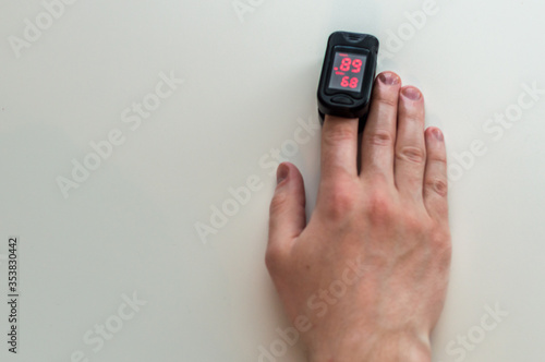 pulse oximeter is placed on the index finger of a man’s hand to measure saturation. Close-up.