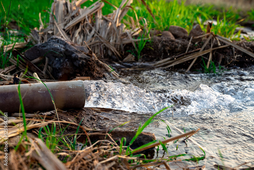 pump pipe water flow equipment agriculture, pump pipe water flow equipment agriculture, Water from a well filled a pond for irrigation,Irrigation water from the source