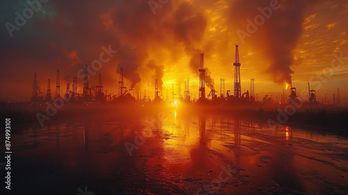 Pumpjacks silhouette in motion against orange sky. Oil derricks at sunset, long exposure, motion blur, silhouette, vibrant orange sky