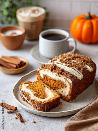 Pumpkin cream cheese loaf cake with coffee and spices on table in autumn setting.