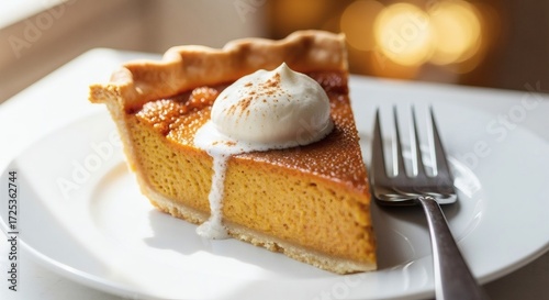Pumpkin pie slice on a white plate with fork in bokeh natural window light background