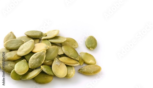 pumpkin seed or pepita are edible and typically flat and oval with one axis of symmetry, have a white outer husk, and are light green after the husk is removed. Isolated on white background