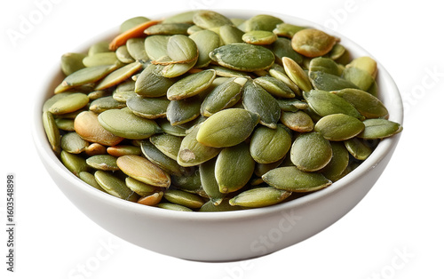 Pumpkin seeds fill a bowl. Illustrates healthy eating and food photography for web, marketing, design, and advertising.