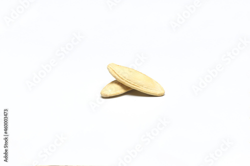 Pumpkin seeds on a white background, isolated. Top view, pumpkin seeds background