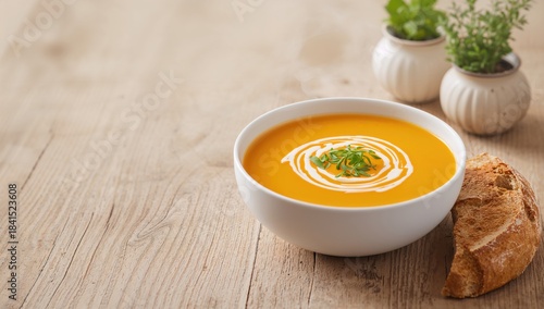 Pumpkin soup in a white bowl on a wooden surface, highlighting nutritious meal choices and dietary awareness