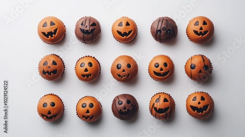 Pumpkin-shaped chocolate truffles decorated with spooky faces, arranged on white background, festive Halloween sweets