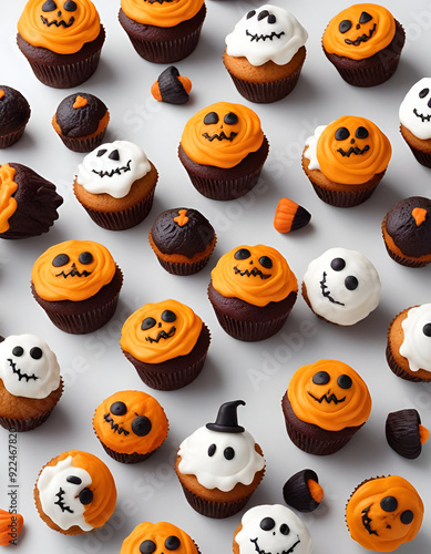 Pumpkin-shaped cupcakes with orange frosting and black bat decorations, on a white background