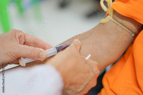 puncture of a vein through the skin in order to withdraw blood for analysis.the specialist uses a syringe to venipuncture from patient's arm. selective focus