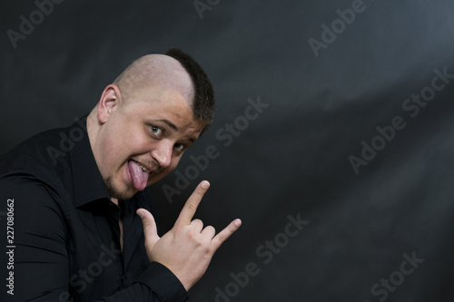 Punk shows language. The fingers of the right hand express confidence in success. The expression is ironic and teasing. copy space