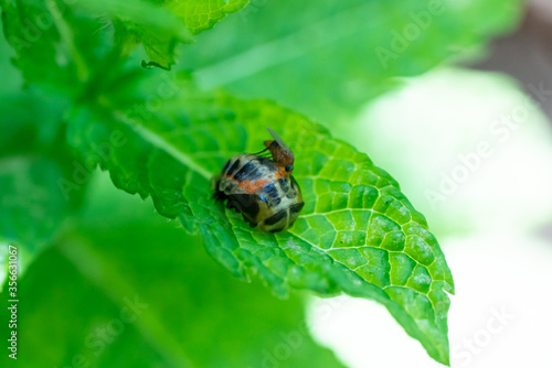 Pupation of a ladybug on a mint leaf with a mosquito on it. Macro shot of living insect. Series image 7 of 9
