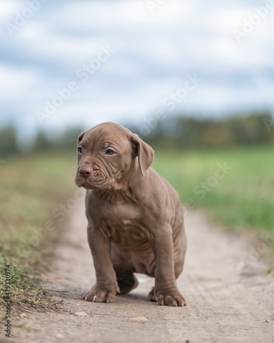 Puppies of a thoroughbred American Pit Bull Terrier are playing on a green field.