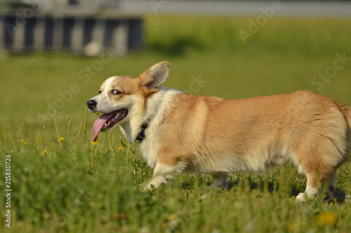 Puppy Corgi pembroke on a walk. Young energetic dog on a walk. Puppies education, cynology, intensive training of young dogs. Walking dogs in nature.
