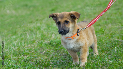 puppy. cute dog on the background of green grass, walks on a leash, outdoors. Portrait of a red puppy close-up. Charming dog posing. the concepts of friendship, veterinary medicine. domestic animal
